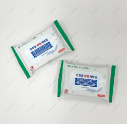간편하게 휴대할 수 있는 물티슈에 맞춤 라벨를 제작한 사례입니다.전면 라벨에는 감염 예방 관련 안내 문구를 담아 정보 전달력을 높였으며, 위생·안전 이미지를 강조한 디자인으로 구성…