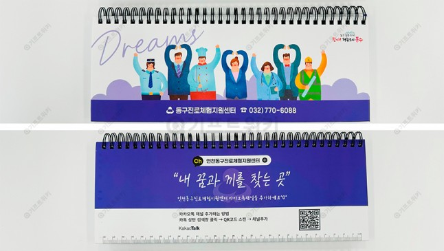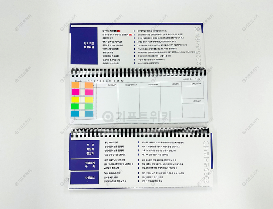 메모 공간이 넉넉해서 스케줄 정리가 편하고, 한눈에 일정 확인이 가능한 플래너입니다. 오랜 기간 꾸준히 재주문해주시는 고객님의 제품으로, 겉표지는 컬러 인쇄, 내지는 로고 1도 인쇄로 제작해드렸습니다!