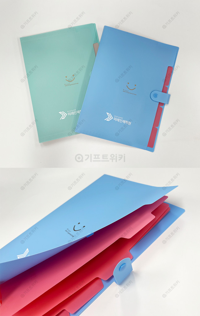 내부 자료 정리 및 배포용으로 사용하기 좋은 인덱스 파일홀더를 제작하였습니다. 파스텔 컬러의 홀더에 실크인쇄 1도로 학원 로고와 문구를 깔끔하게 표현하였으며, 내부는 다섯 개 칸으로 구분되어 있어 다양한 자료를 효율적으로 정리할 수 있으며, 버튼 형식 마감으로 서류가 흘러내리지 않아 안정적인 보관이 가능합니다.