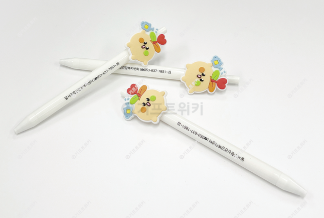 원하는 모양으로 캐릭터를 제작해서 만드는 볼펜입니다. 볼펜 바디에 UV1도인쇄를 추가하여 캐릭터와 상호까지 같이 홍보하기 안성 맞춤입니다.