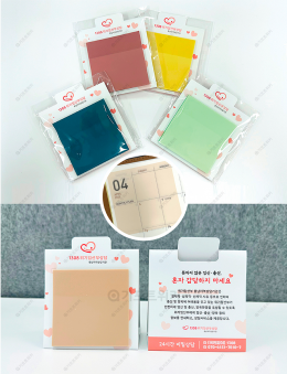 스탠드형으로 책상 위에 두고 쓰다 보니 지속적으로 홍보문구를 노출할 수 있는 메모지입니다! 50매 구성으로 되어있는 메모지는 반투명 원단으로 필기에 유용합니다 :D