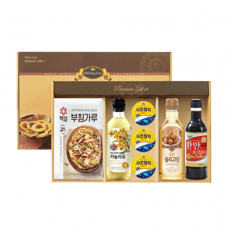 • 구성 백설 부침가루 500g 1개, 백설 카놀라유 500ml 1개, 사조 살코기 참치 85g 3개, 백설 요리 올리고당 500g 1개, 롯데 환만진간장 480ml 1개