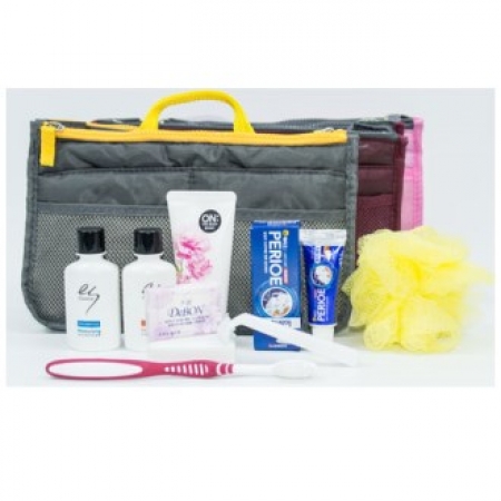 • 구성 (엘라스틴샴푸+린스+바디+치약20g+긴칫솔+비누+비누곽+면도기+샤워볼)+더블포켓이너백