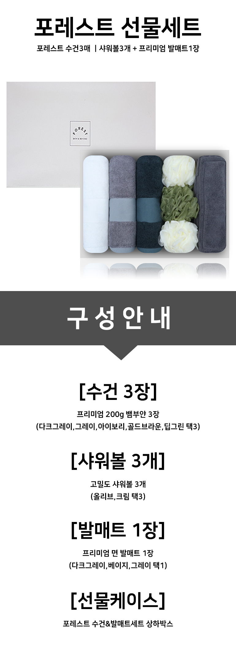 포레스트 선물세트 호텔타올 200g 뱀부얀 3장+샤워볼 3개+면 발매트 1 요약정보 및 구매