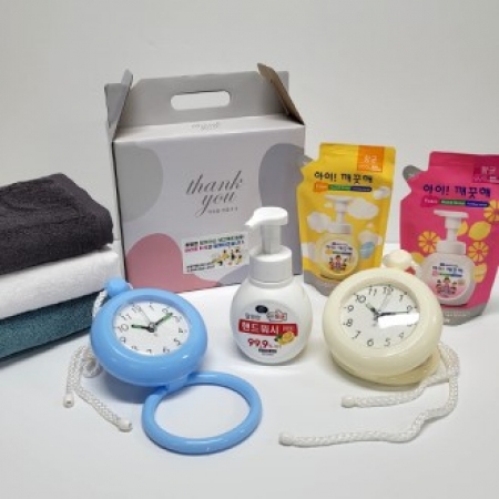 • 구성 깔끔한 핸드워시 300㎖ 1개, 아이깨끗해 핸드워시 리필 200㎖ 1개, 타올걸이 시계 1개, 송월타올 1개, 선물상자