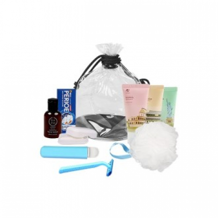 • 구성 파우치, 치약, 칫솔, 샴푸, 린스, 바디워시, 로션, 면도기, 비누, 샤워볼