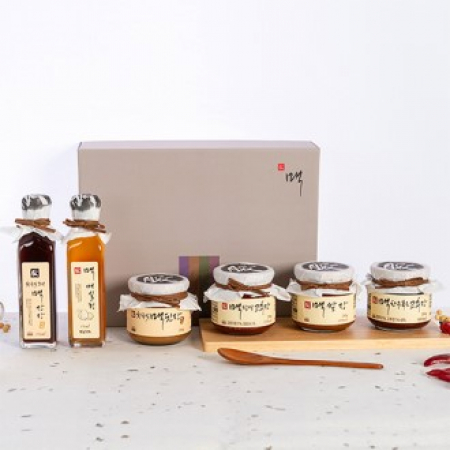 • 구성 황금빛맥된장 250g, 맥찹쌀고추장 250g, 쌈장 250g, 한우볶음고추장 250g, 황금빛간장 300ml, 매실청 300ml
