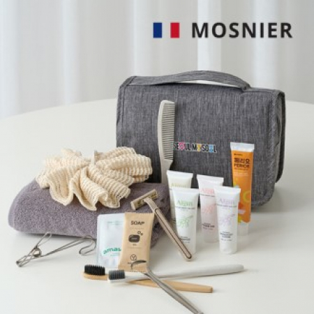생분해 칫솔,대나무 칫솔,페리오 치약 50g,혀 클리너,바디로션 35ml,샴푸 35ml,샤워젤 35ml,컨디셔너 35ml,비누 10g,집게,타올 160g,모시 샤워볼,트래블 백,생분해빗,생분해면도기,쉐이빙젤