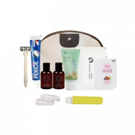 • 구성 파우치,샴푸,린스,바디워시,샤워타올,일회용폼클렌징,비누,3중면도기,비누