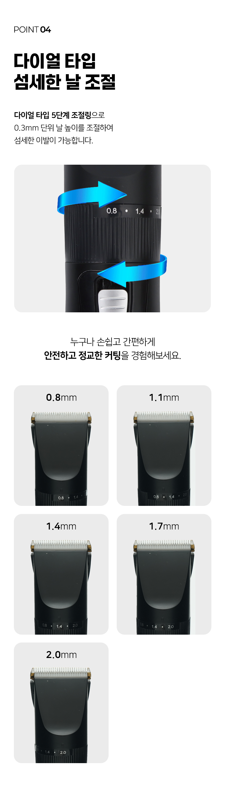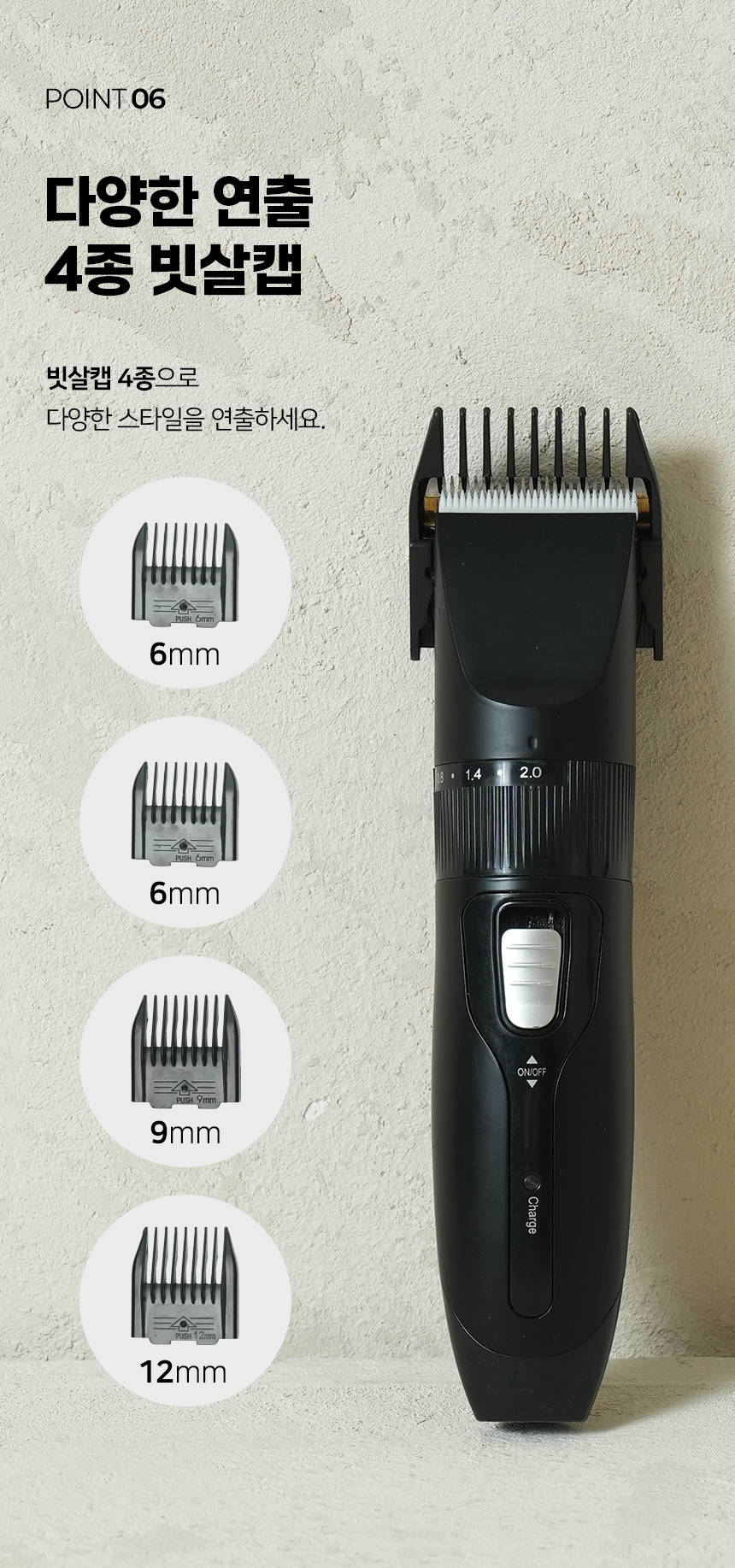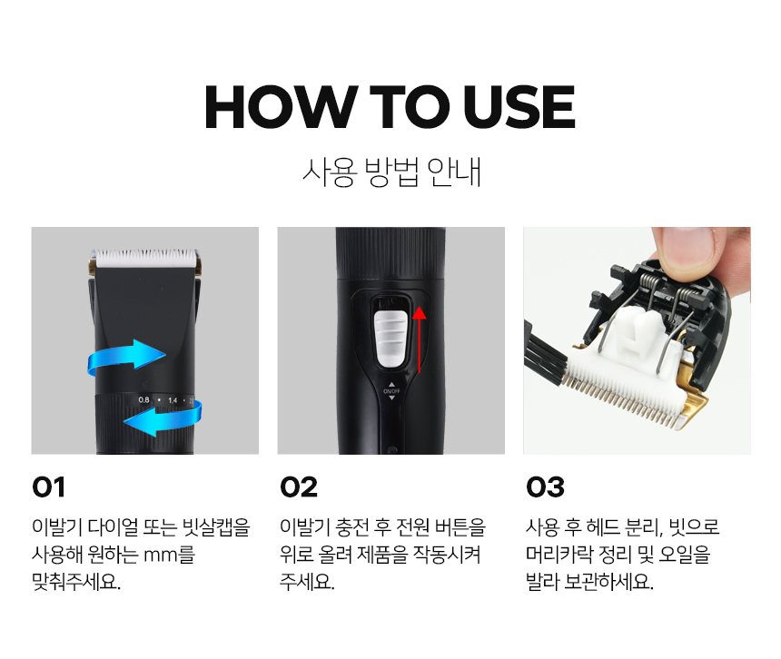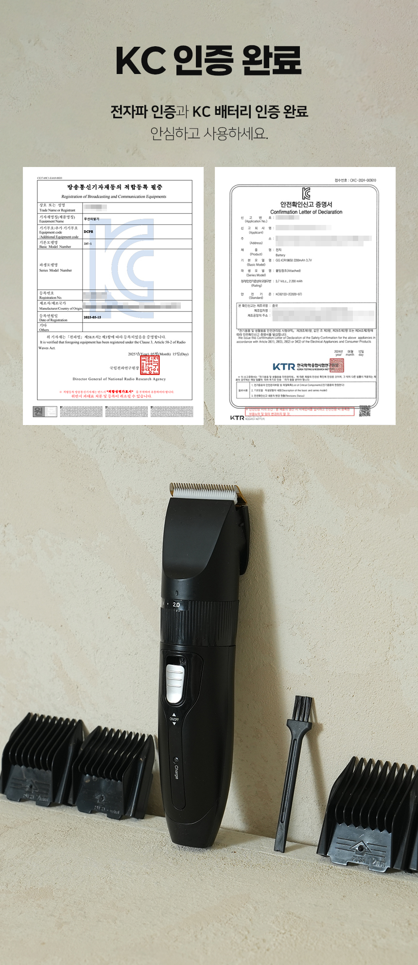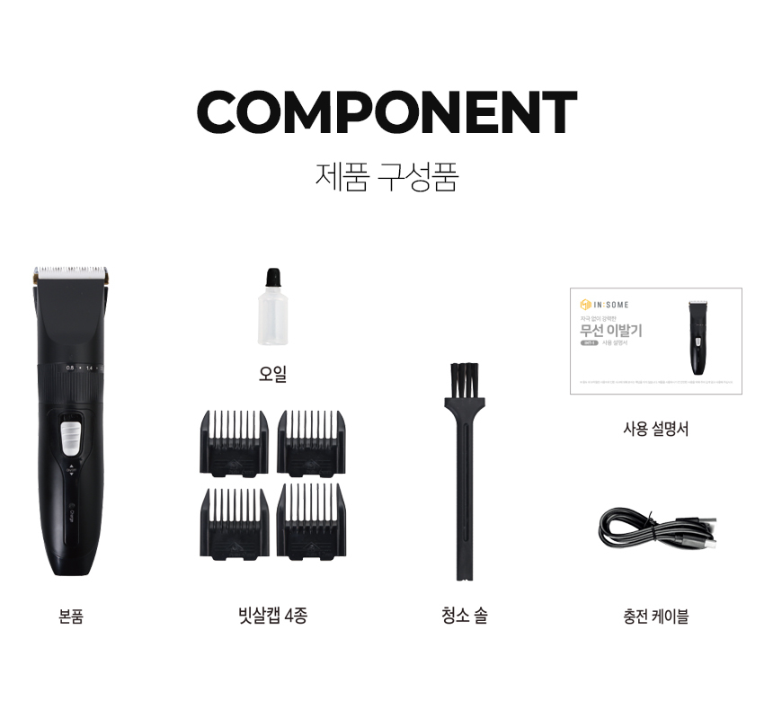 • 구성 본품, 4종 빗살캡, 청소솔, 오일, 충전케이블, 사용설명서