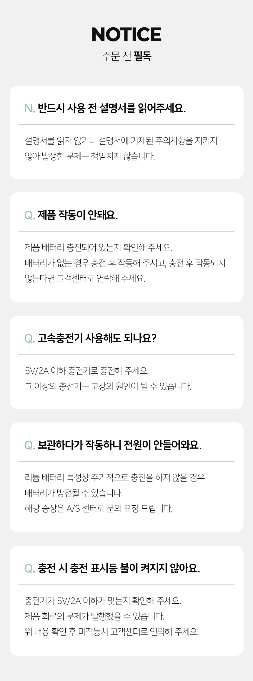 • 받으신 제품에 문제가 있을 경우, 상품 수령 후 7일 이내에 이의제기 신청해주셔야 확인 후 처리가 가능합니다. 너무 오랜기간 지난 후 요청건은 처리 불가능합니다.