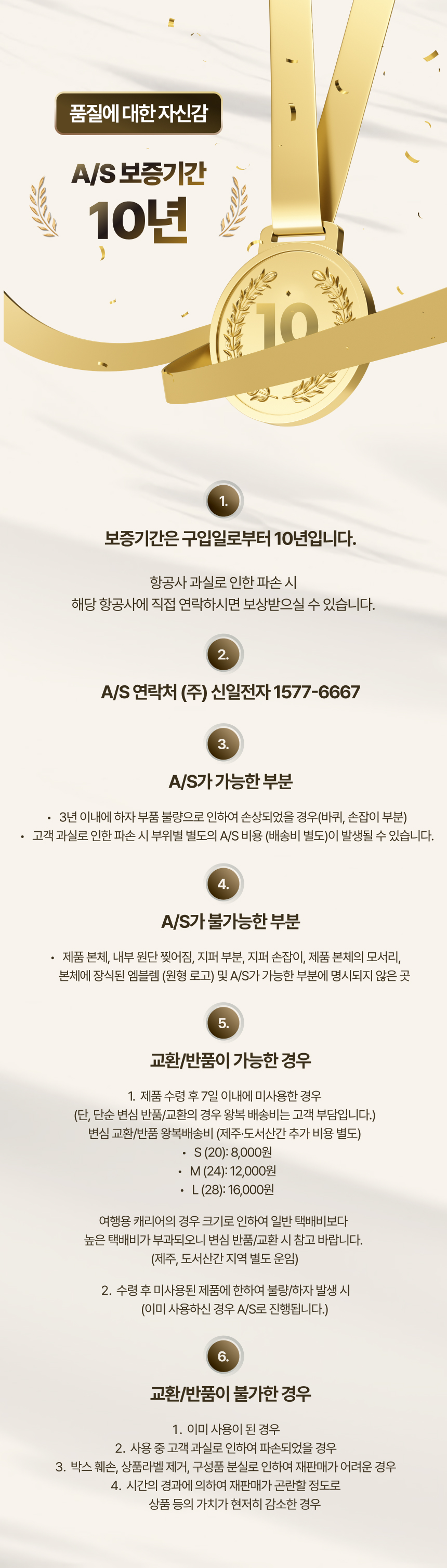 무상 10년 (단, 소비자 귀책이나 항공사에 의한 파손은 책임지지 않음)