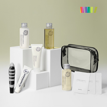 삼푸, 컨디셔너, 샤워젤, 로션, 치약, 칫솔, 클렌징폼 3P, 파우치, 종이케이스