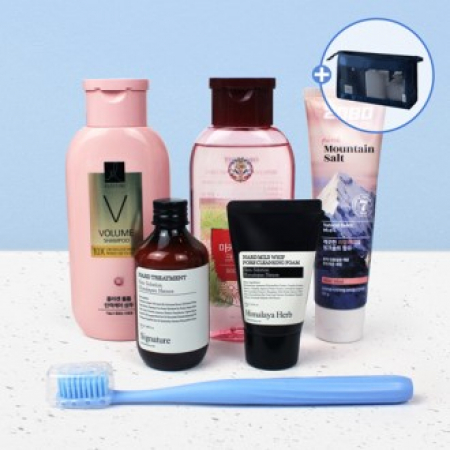 • 구성 LG 엘라스틴 샴푸+LG 마카다미아 바디워시+Nard 클렌징폼+트리트먼트+2080 핑크솔트 치약 120g+부케가르니 미세모칫솔+여행용파우치