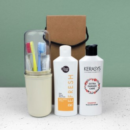 • 구성 휴대용양치컵 + 부캐가르니 미세모 칫솔2개 + 프리미엄 위덴치약 2개+ 캐라시스 샴푸+바디워시+끈케이스