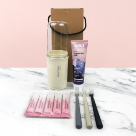 • 구성 휴대용 양치컵 + 2080 핑크솔트 치약 120g + 2080 핑크솔트 가글 마우스워시 5매 + Nard나드 이중미세모 칫솔 3개+종이케이스