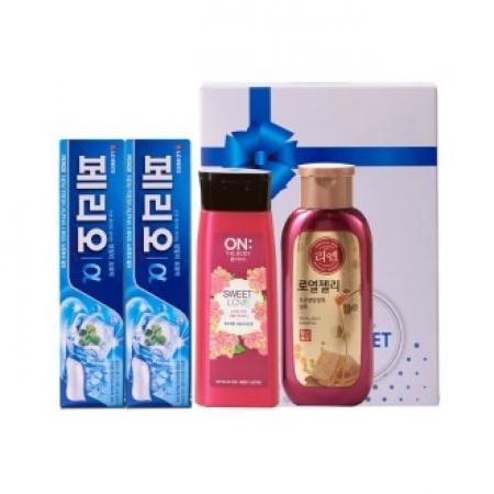 • 구성 리엔 로열젤리 샴푸200ml 1개, 온더바디 퍼퓸 바디워시 180g 1개, 페리오 알파치약 2개