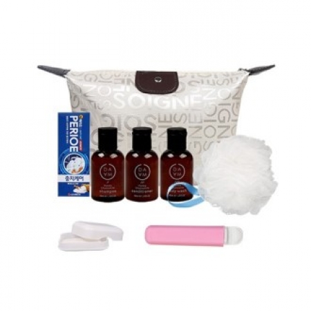 • 구성 8종 [파우치, 치약, 칫솔, 샴푸, 린스, 바디워시, 샤워볼, 비누]