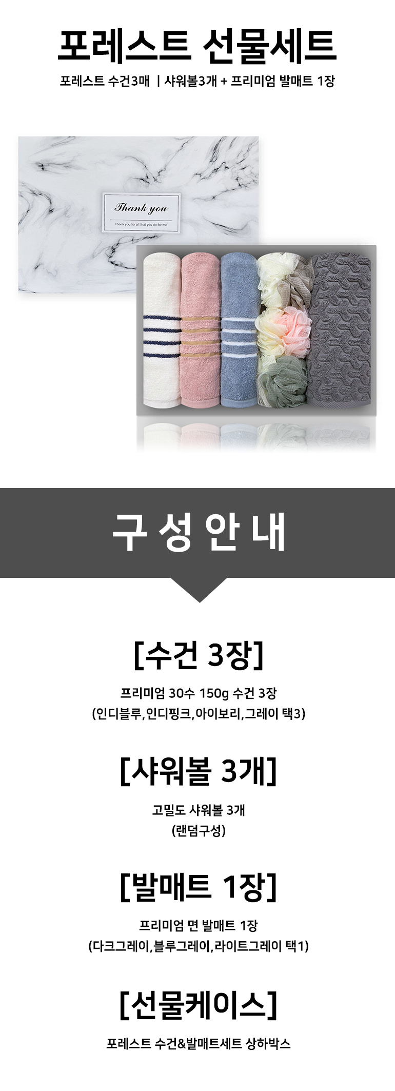 • 포레스트 르블랑 선물세트 호텔타올 30수 150g 3장 + 샤워볼 3개 + 면 발매트 1장 (+0원)