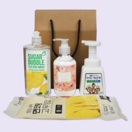 • 구성 주방전용 아이깨끗해 +부케가르니 펌핑형 핸드크림 290ml + 슈가버블 주방세제 + 면코팅고무장갑 + 끈케이스