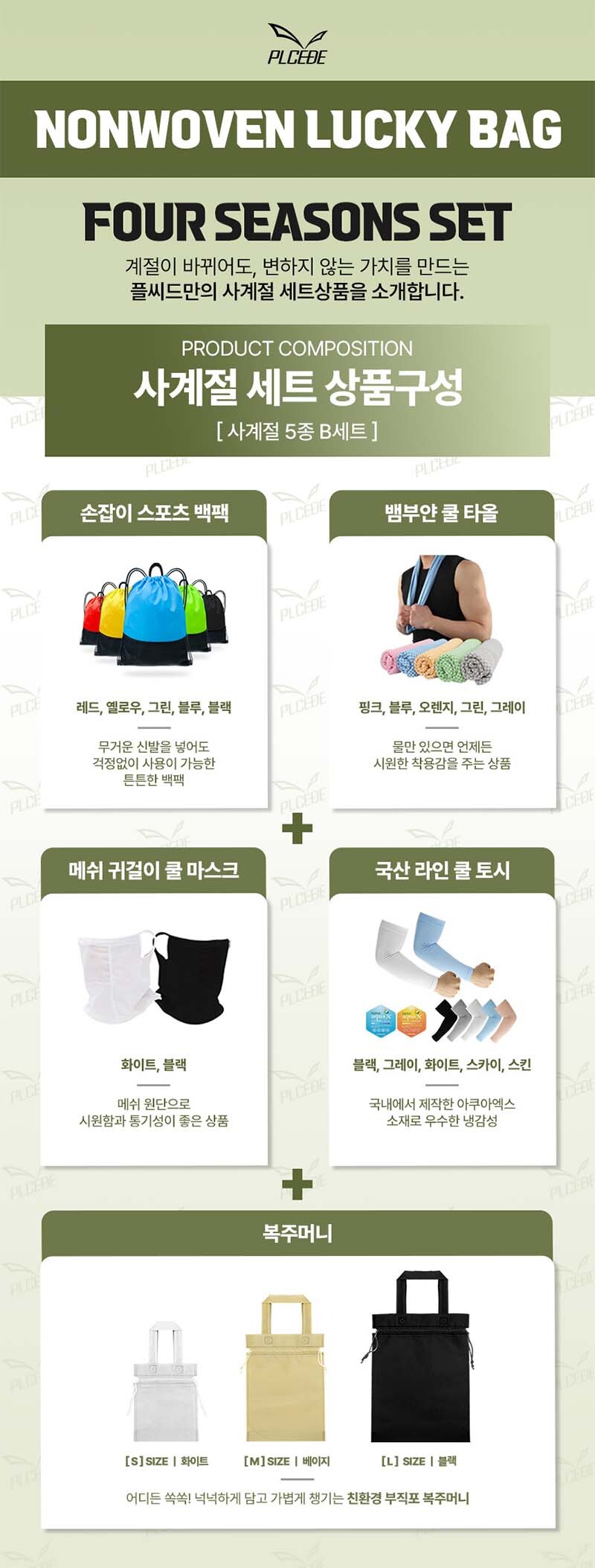 플씨드 사계절 5종 복주머니 파우치 B세트 (손잡이 스포츠 백팩+뱀부얀 쿨타올+메쉬 귀걸이 쿨마스크+라인 쿨토시) 요약정보 및 구매