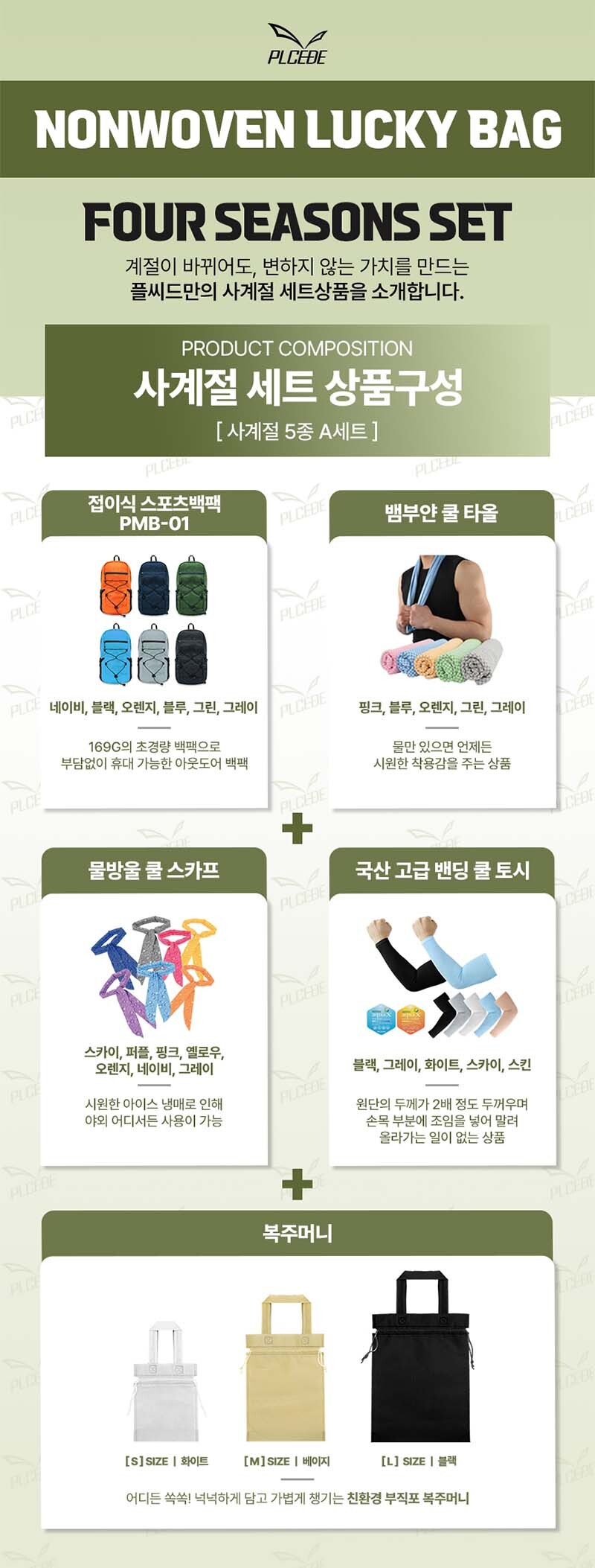 플씨드 사계절 5종 복주머니 파우치 A세트 (프리미엄 접이식 스포츠 백팩PMB-01+뱀부얀 쿨타올+물방울 쿨스카프+고급 밴딩 쿨 토시) 요약정보 및 구매