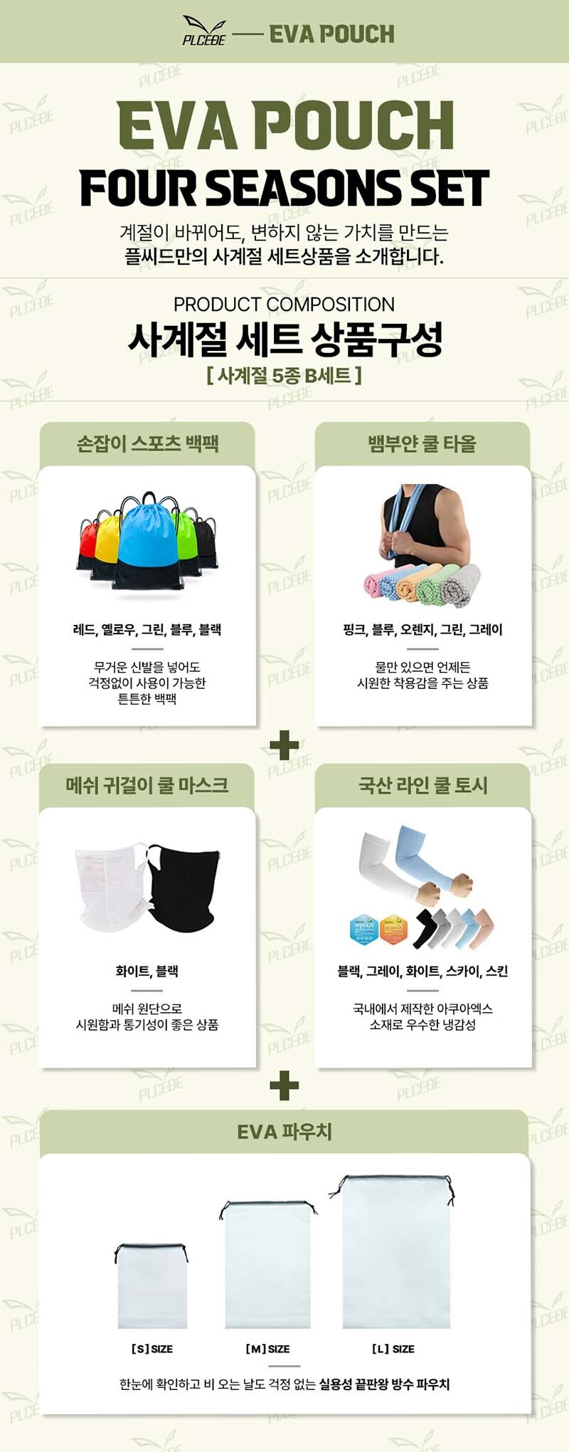 플씨드 사계절 5종 EVA 파우치 B세트 (손잡이 스포츠 백팩+뱀부얀 쿨타올+메쉬 귀걸이 쿨마스크+라인 쿨토시) 요약정보 및 구매
