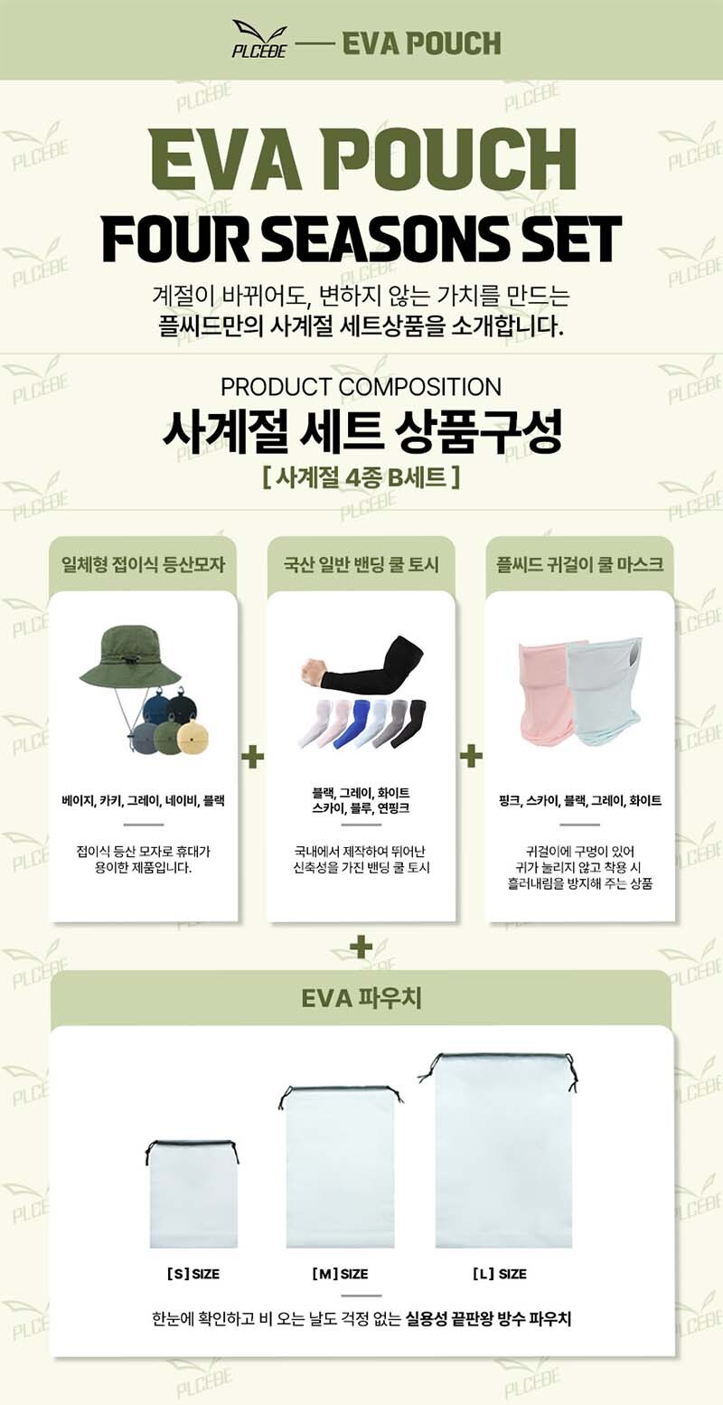 • 모델명 플씨드 사계절 4종 EVA파우치 B세트 (일체형 접이식 등산모자+일반 밴딩 쿨토시+귀걸이 쿨마스크)
