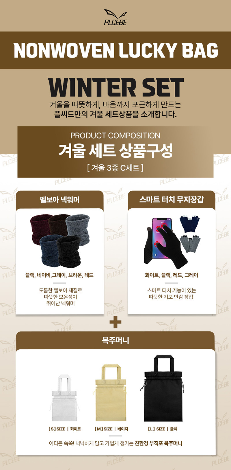• 모델명 플씨드 겨울 3종 복주머니 파우치 C세트 (벨보아 넥워머+스마트 터치 무지 장갑)