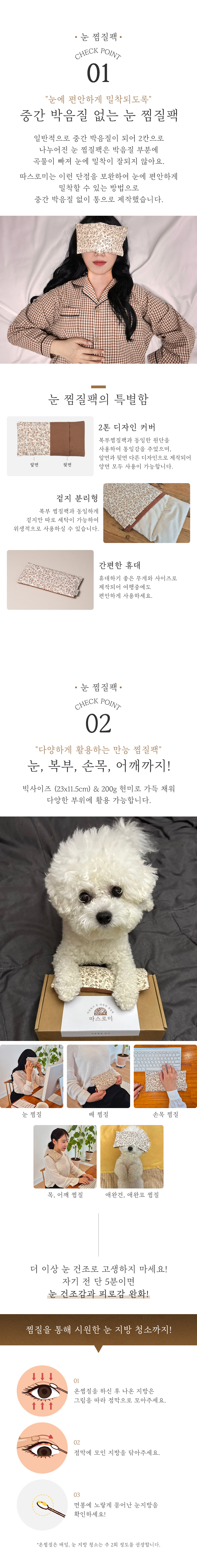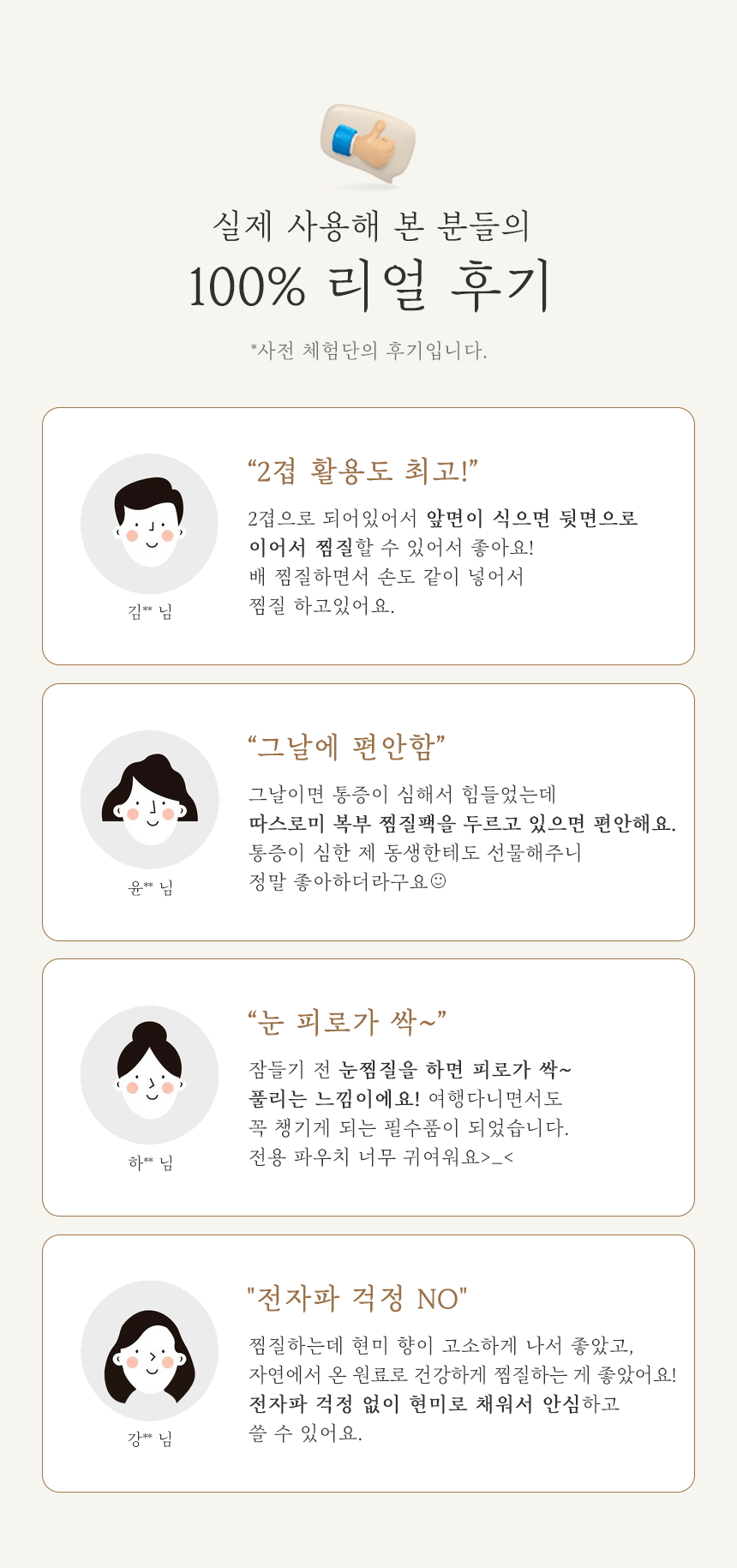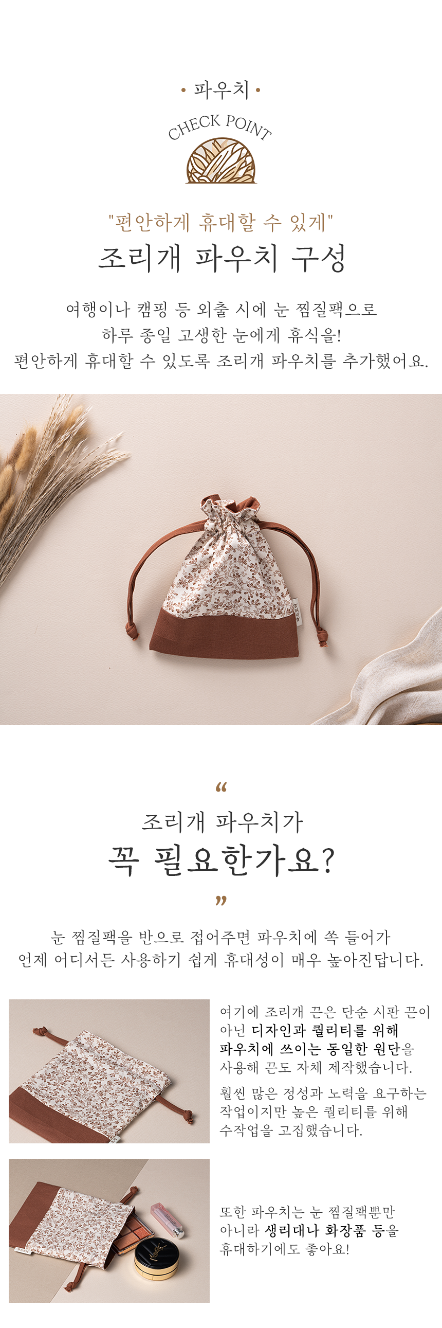 • 구성 복부 찜질팩(커버+속통) + 눈 찜질팩(커버+속통) + 파우치 + 종이케이스 + 사용설명서