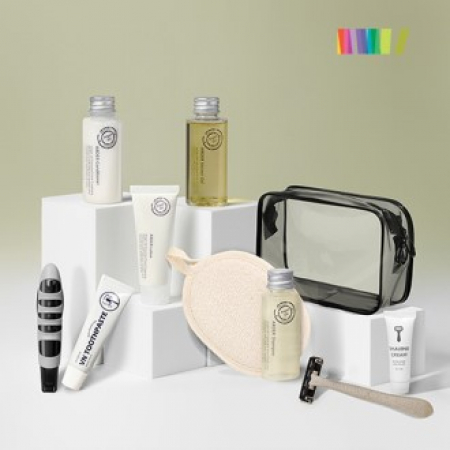 삼푸, 컨디셔너, 샤워젤, 로션, 치약, 칫솔, 면도기,쉐이빙폼, 샤워패드, 파우치, 종이케이스