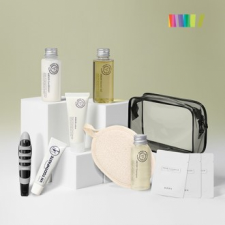 삼푸, 컨디셔너, 샤워젤, 로션, 치약, 칫솔, 클렌징폼 3P, 샤워패드, 파우치, 종이케이스