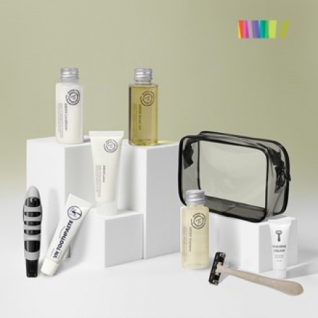 삼푸, 컨디셔너, 샤워젤, 로션, 치약, 칫솔, 면도기,쉐이빙폼, 파우치, 종이케이스