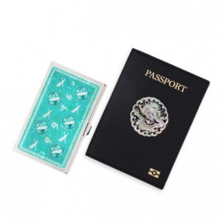 • 바이어 선물 곤룡포 나전 한지가죽 여권지갑+청자상감운학문 자개명함케이스 세트 자개공예 한국 전통 기념품 (+0원)