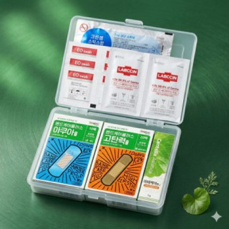 • 구성 동국제약 고탄력밴드 20매+동국제약 아쿠아 방수밴드 10매+마데케어연고+스틱스왑 2개+랩신 손소독티슈 2개+알콜스왑 6개+미니구급 케이스+조이케이스 추가 별도문의