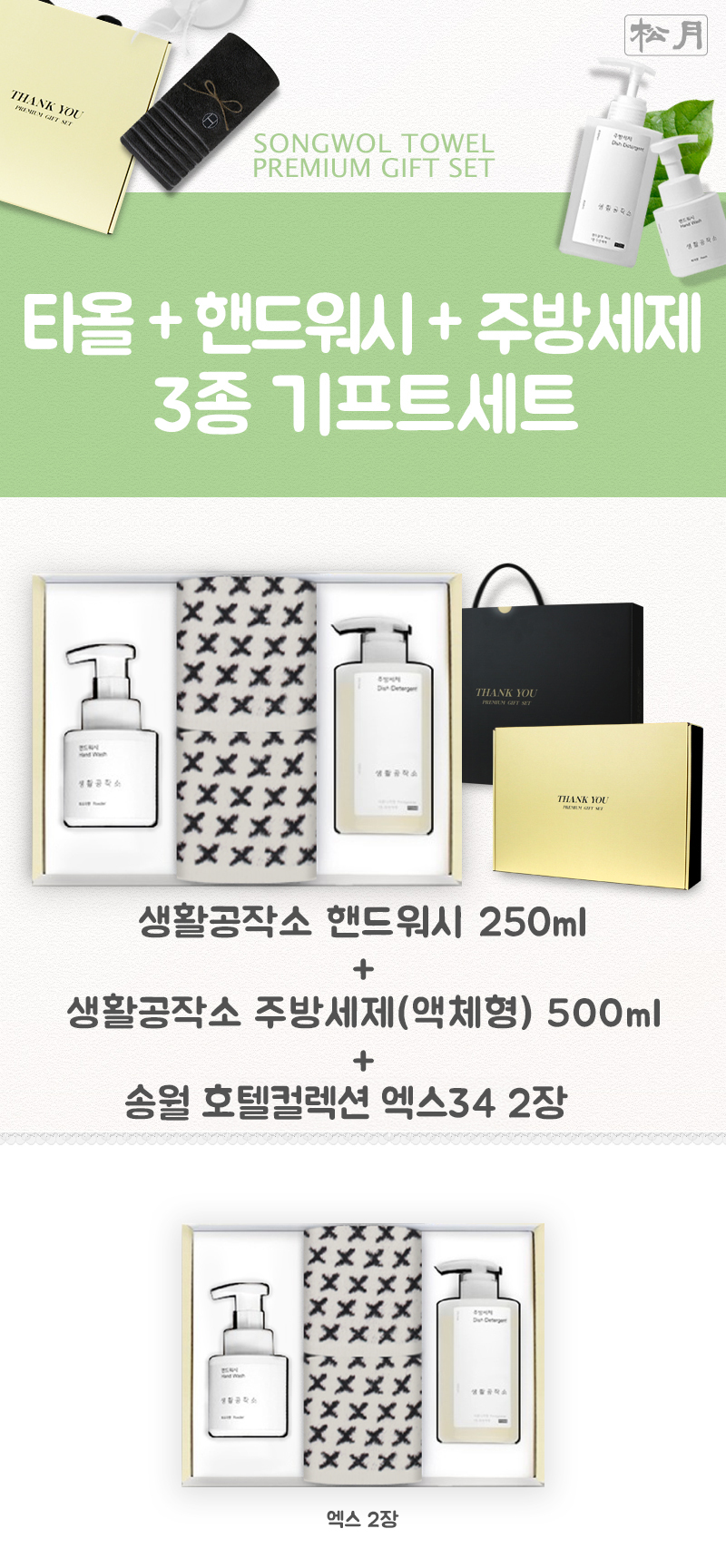 • 구성 핸드워시 250ml 1개 + 주방세제 500ml 1개 + 호텔컬렉션 엑스34 2장