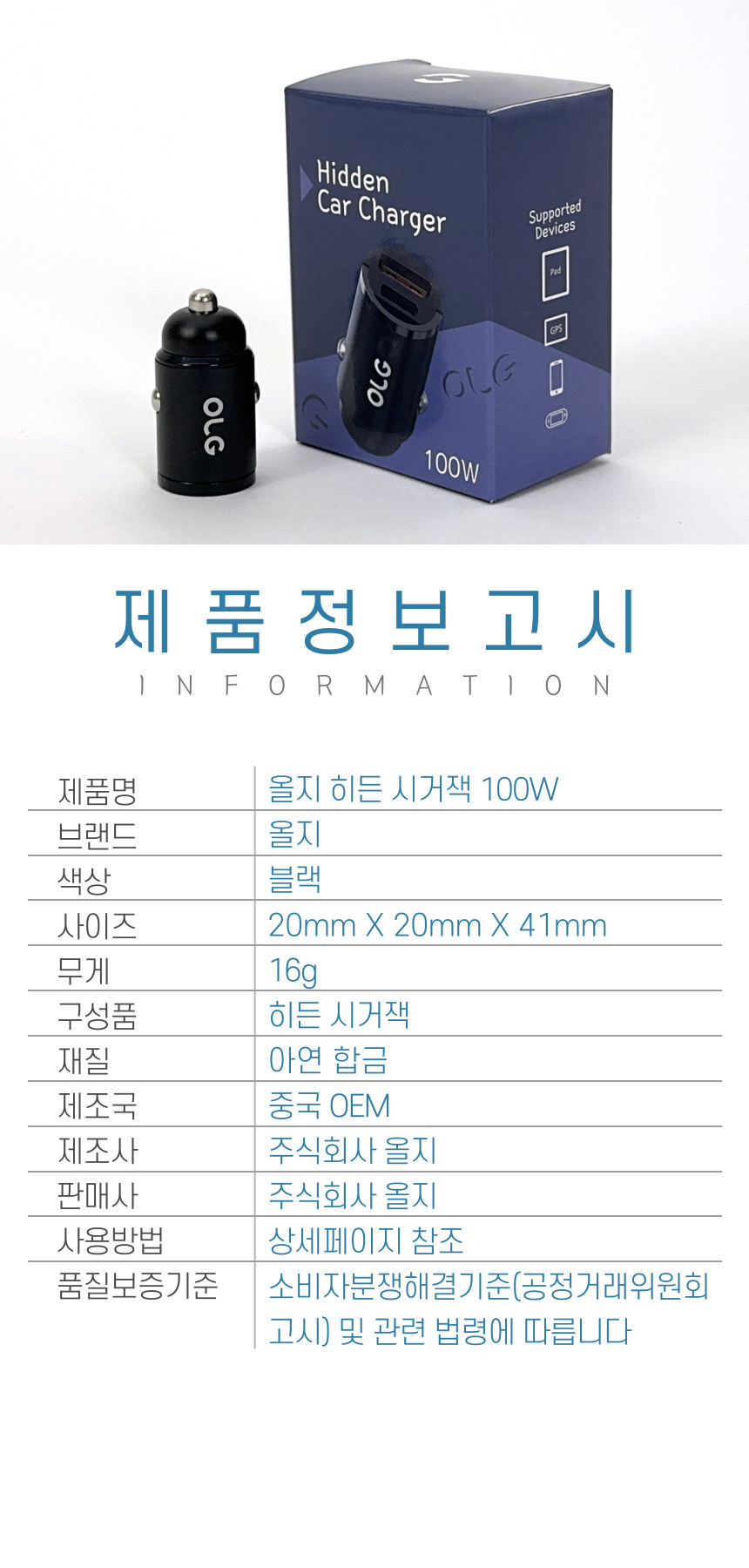 올지 히든 시거잭 100W 더블 멀티 충전 시가잭 2구 소켓 차량용 C타입 5핀 요약정보 및 구매
