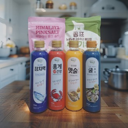 • 구성 부침가루1p(500g), 히말라야핑크솔트1p(400g), 굴소스1p(500ml), 홍게간장1p(500ml), 맛술1p(500ml), 참치액1p(500ml)