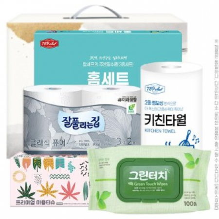 • 구성 미용티슈150매,클래식퓨어25M(107mm,3겹)2롤,키친타올(228×114mm)60매,홈세트(크린백50매,위생장갑30매,컬러지퍼백5매),물티슈100매(245g)