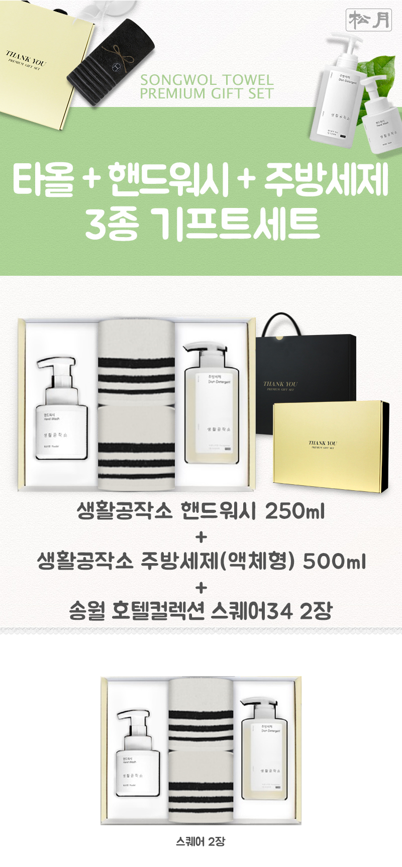 • 구성 핸드워시 250ml 1개 + 주방세제 500ml 1개 + 호텔컬렉션 스퀘어34 2장